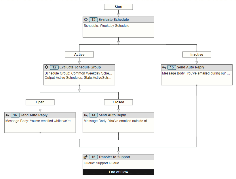 • From the Toolbox, drag an appropriate action below the Evaluate Schedule action’s Inactive path. For example, a Send Auto Reply action that lets customers know they emailed during non-business hours and should expect a delayed reply.