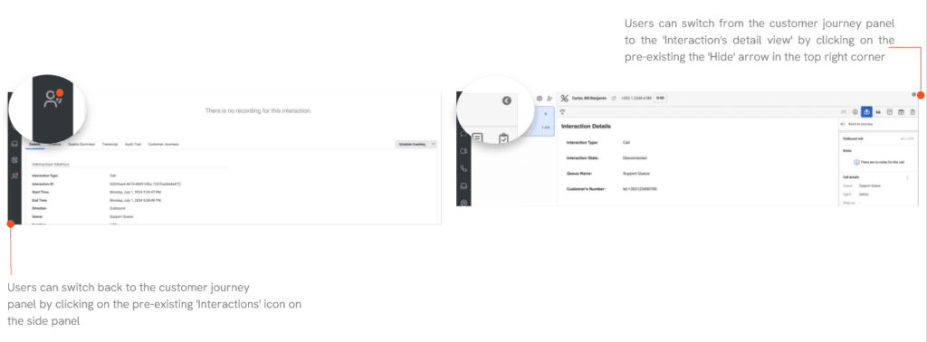 Users can switch between the customer journey panel and the interaction’s detail view by clicking on the pre-existing Interactions icon on the agent side panel and the pre-existing Hide arrow in the top right corner.